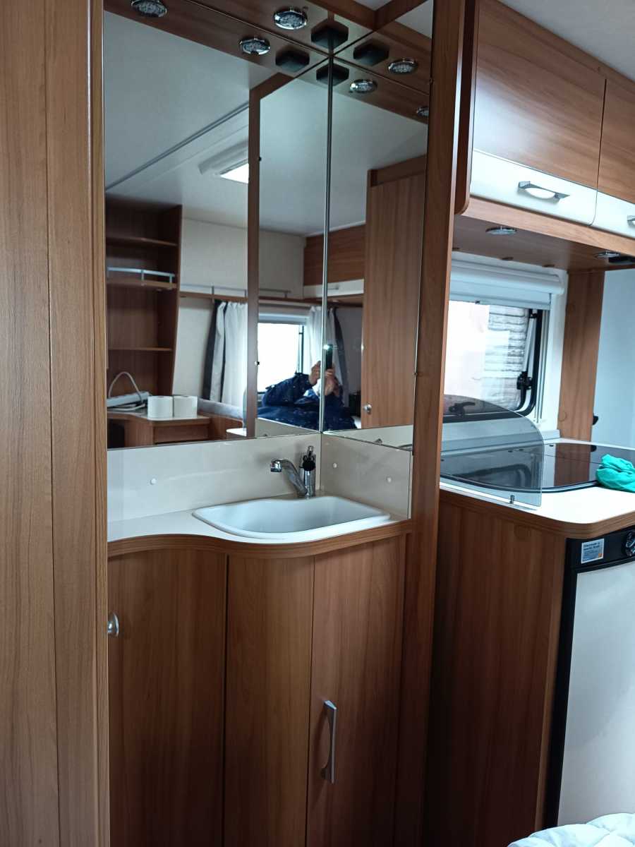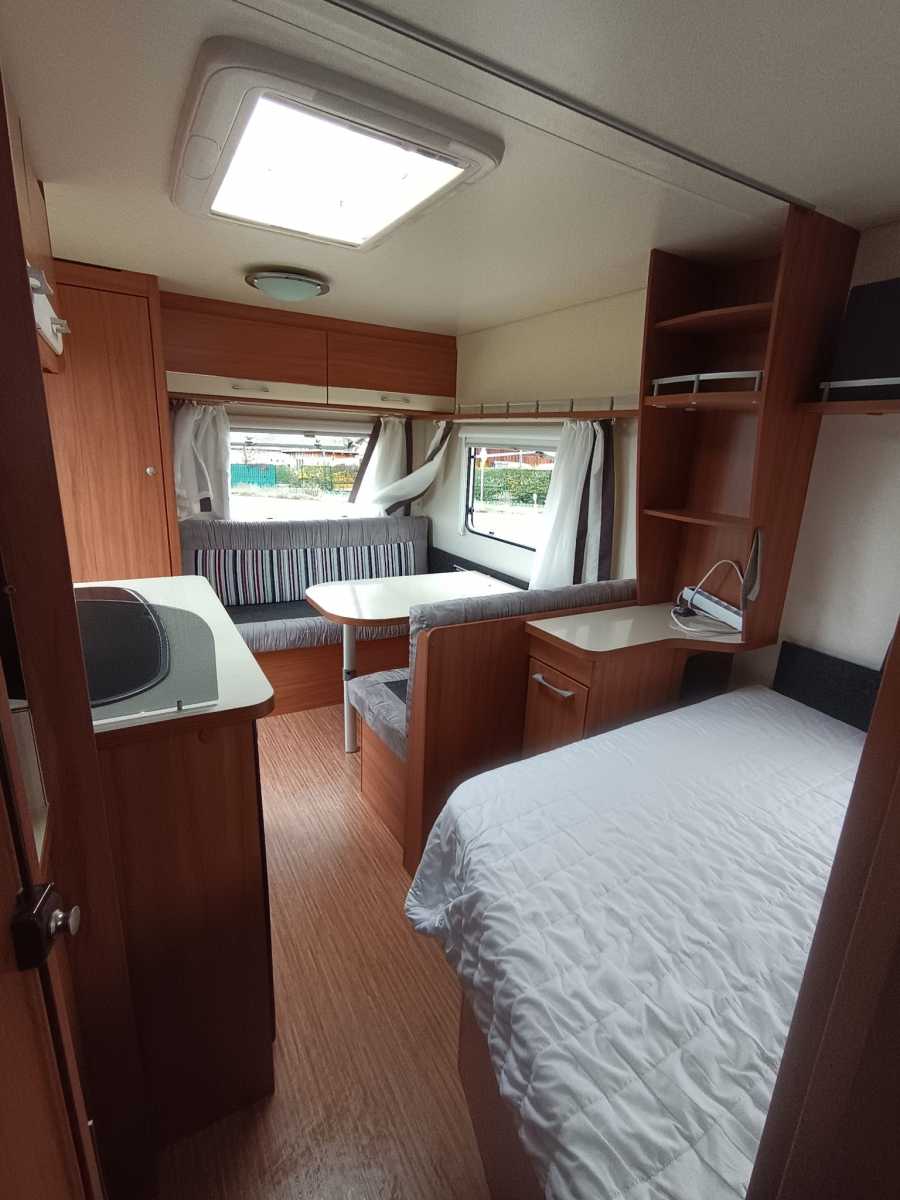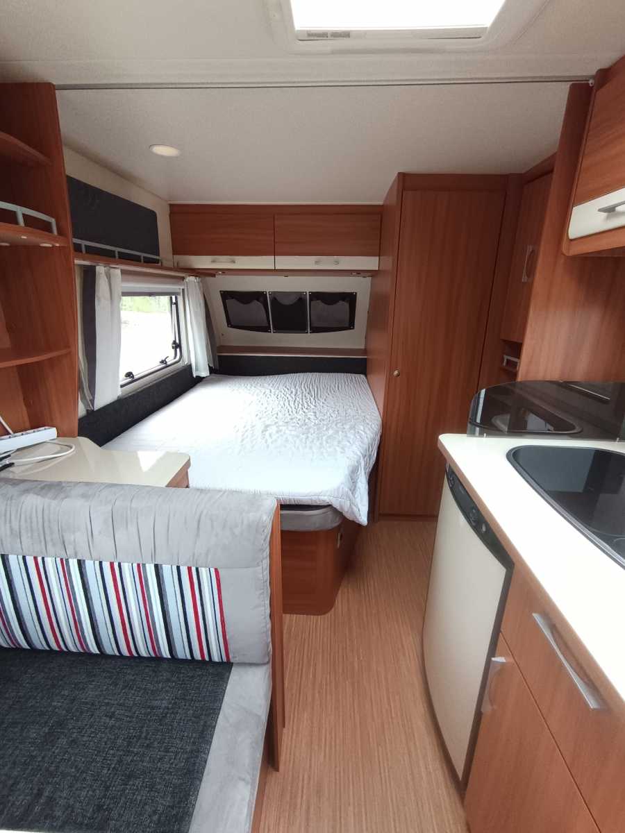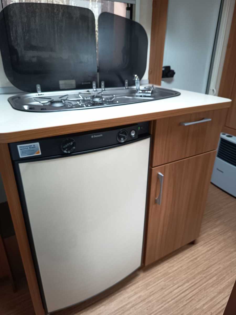 Der Wohnwagen hat ein Festbett incl. Topper für 2 Personen und eine Sitzgruppe die zu einem weiteren Bett umgebaut werden kann. Die Dusche ist großzügig bemessen, ein Waschbecken mit Spiegel und Badmöbeln befindet sich außerhalb des WC und Duschraums. Alle Fenster haben Rollos und Fliegengitter, an der Eingangstür befindet sich ebenfalls ein Fliegengitter. Der Wohnwagen ist ideal für 2-3 Personen und kann aufgrund des geringen Gewichts auch von kleineren Fahrzeugen gezogen werden. Der Mover macht das Rangieren einfach. Hunde sind gestattet. Stauraum ist sehr großzügig vorhanden.