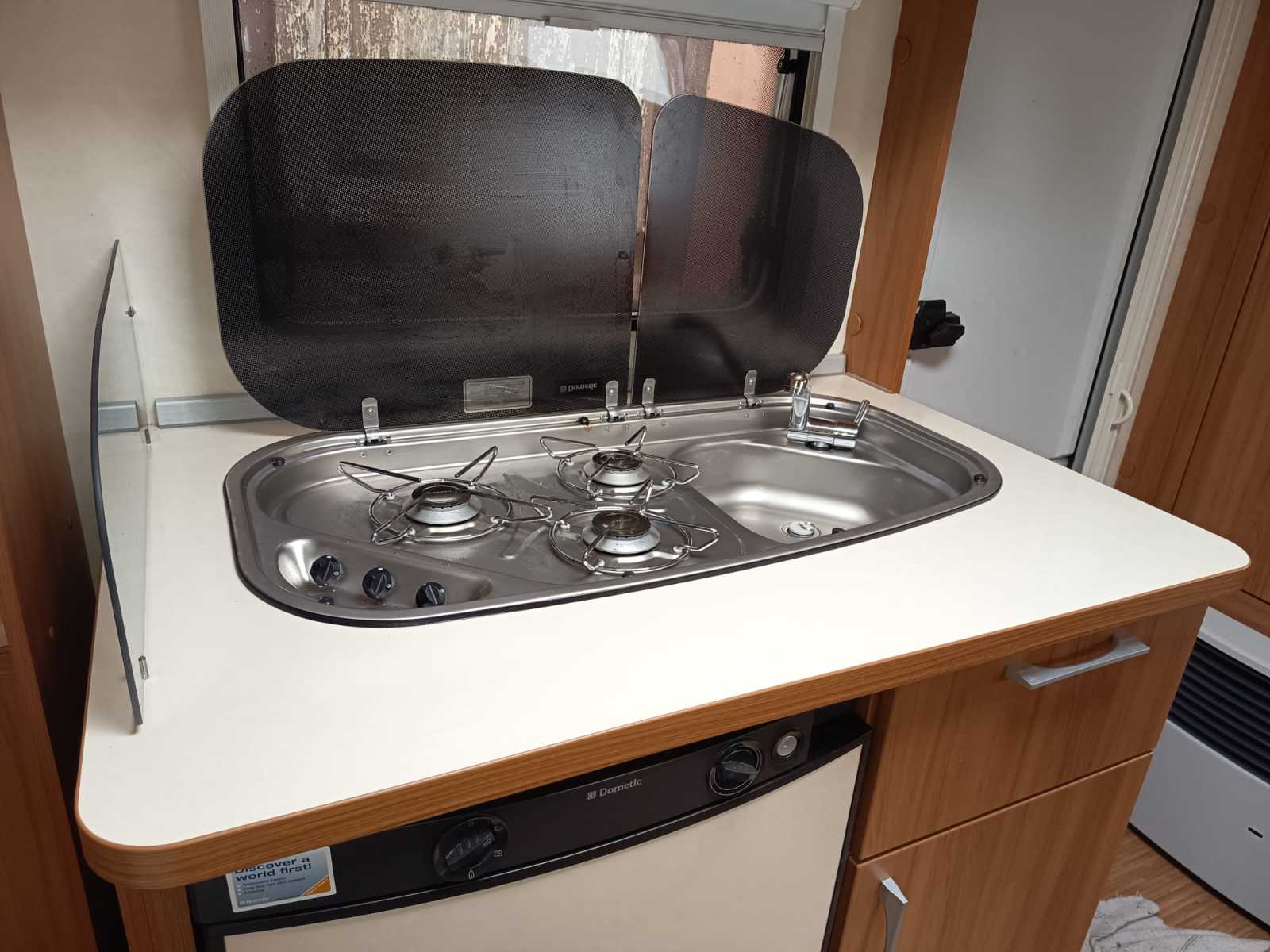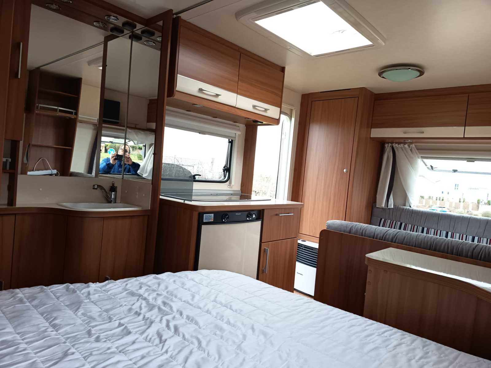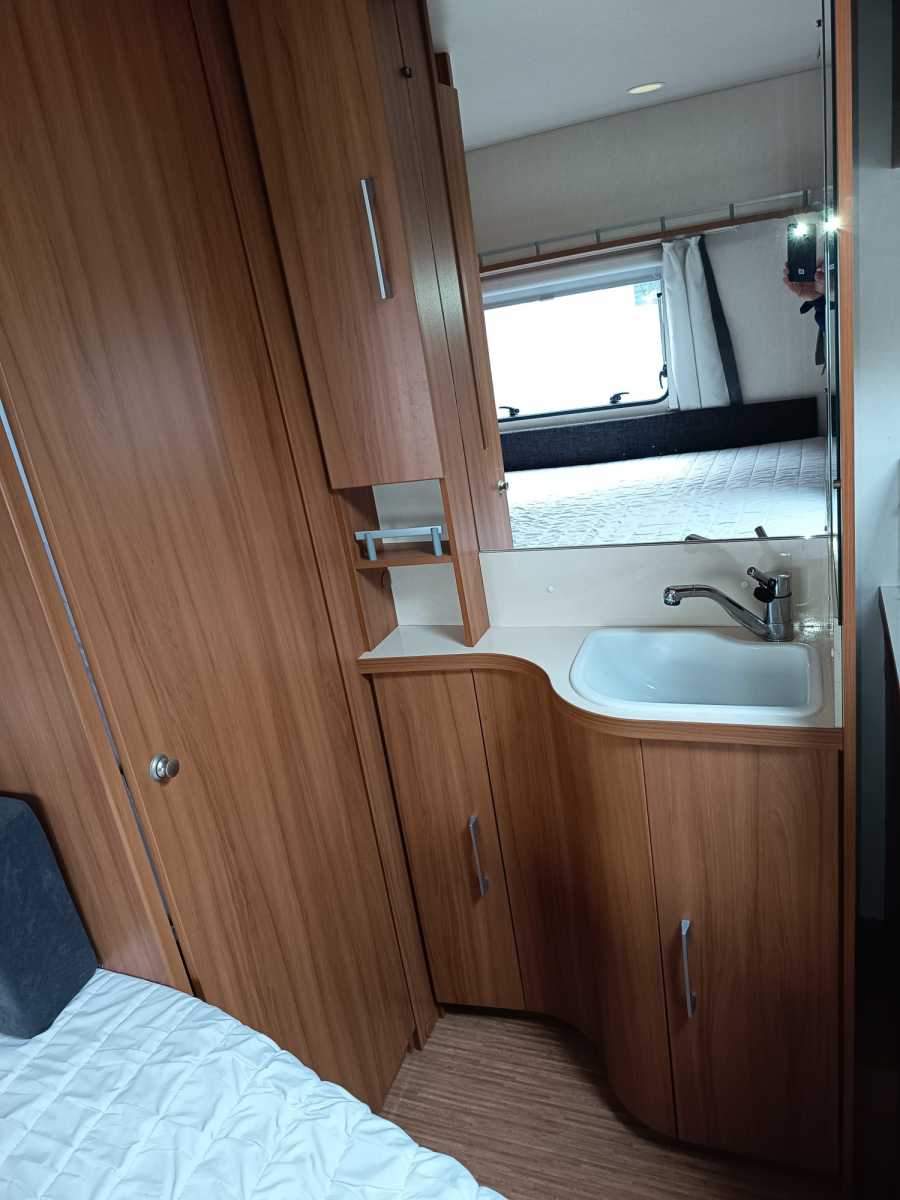 Der Wohnwagen hat ein Festbett incl. Topper für 2 Personen und eine Sitzgruppe die zu einem weiteren Bett umgebaut werden kann. Die Dusche ist großzügig bemessen, ein Waschbecken mit Spiegel und Badmöbeln befindet sich außerhalb des WC und Duschraums. Alle Fenster haben Rollos und Fliegengitter, an der Eingangstür befindet sich ebenfalls ein Fliegengitter. Der Wohnwagen ist ideal für 2-3 Personen und kann aufgrund des geringen Gewichts auch von kleineren Fahrzeugen gezogen werden. Der Mover macht das Rangieren einfach. Hunde sind gestattet. Stauraum ist sehr großzügig vorhanden.
